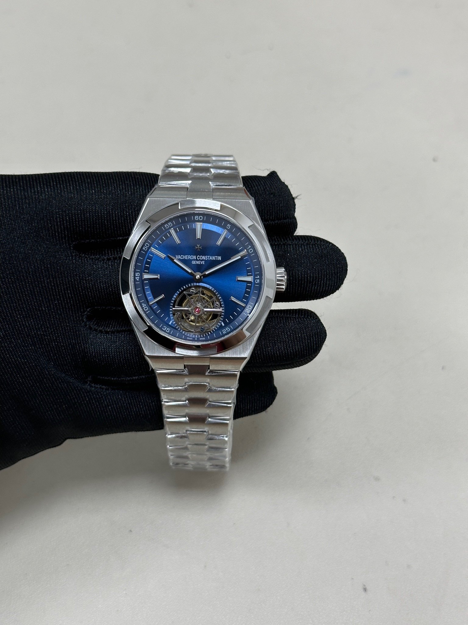 Vacheron Constantin Overseas Tourbillon 6000V/110A-B544tourbillon movement at 6 o’clock42.5mm diameterstainless steel casequick-release strap systemsapphire crystal150m water resistance.