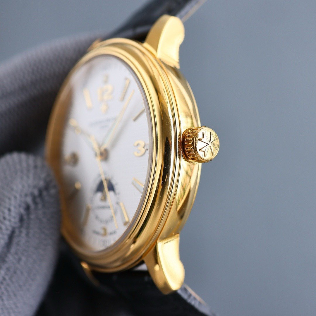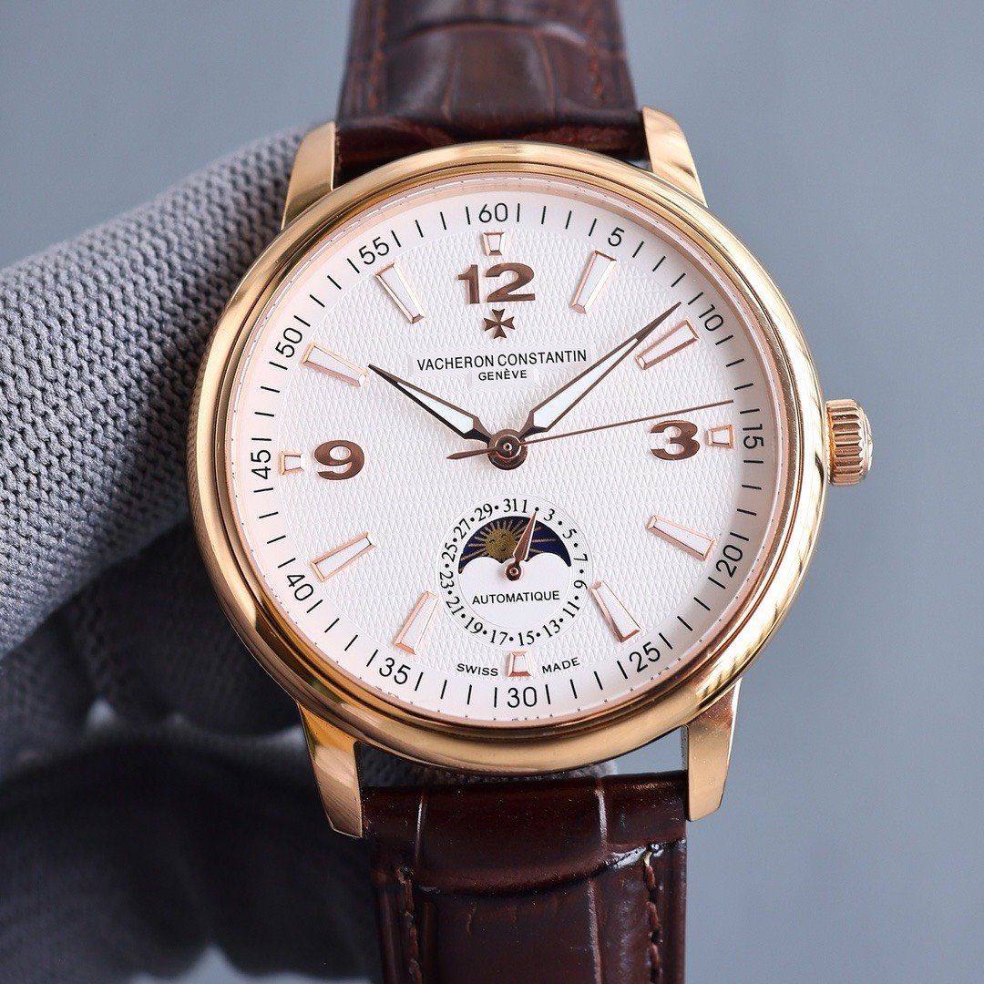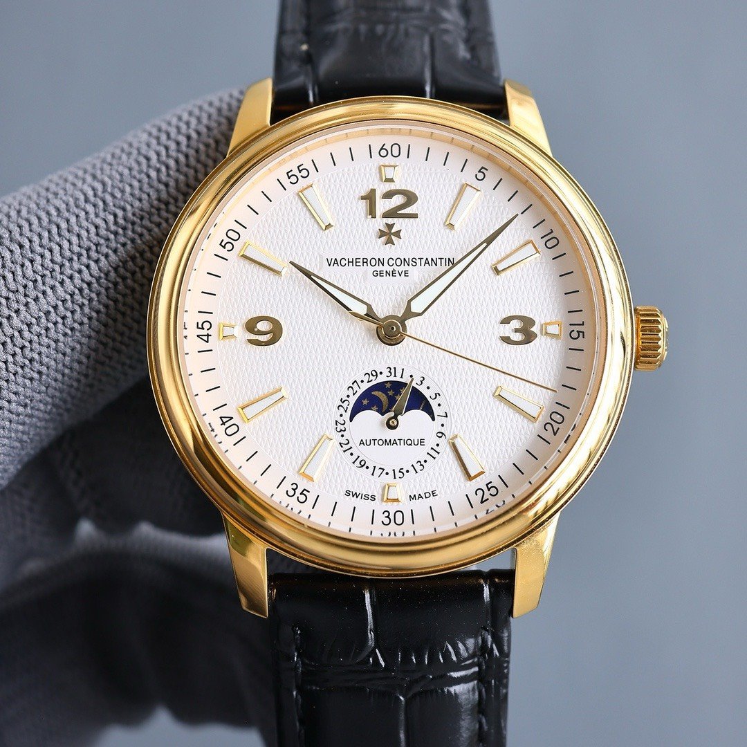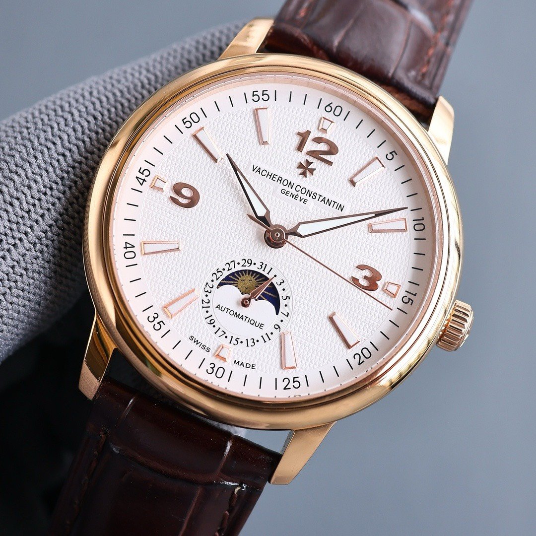 Vacheron Constantin Patrimony watch. 40mm. Automatic mechanical movement with ETA2824-2 caliber. Steel case. Sapphire crystal. Moonphase and date at 6 o’clock. Italian calfskin leather strap. Water-resistant to 3 bar (approx. 30 meters).